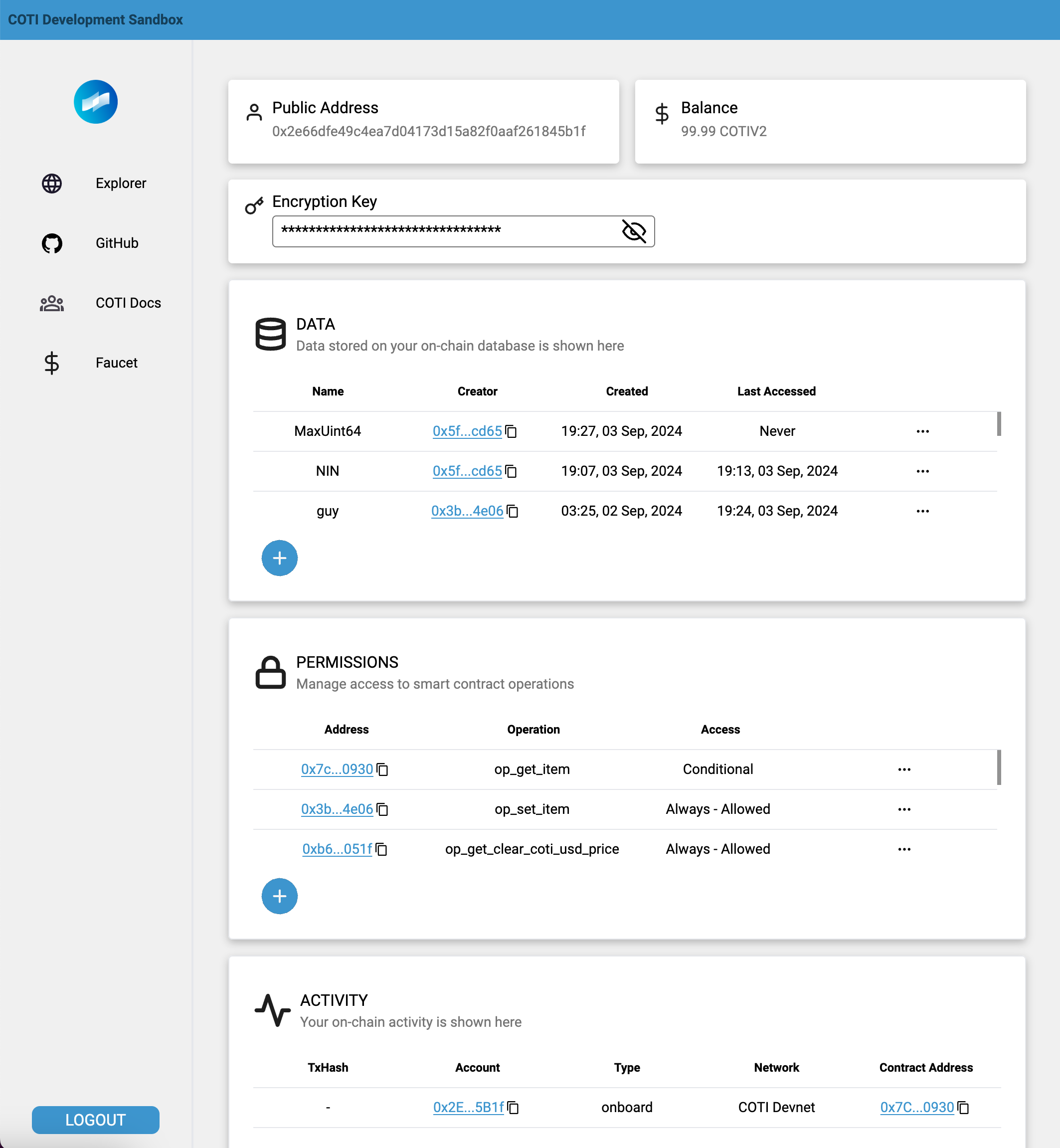 <figure><img src="https://2557786554-files.gitbook.io/~/files/v0/b/gitbook-x-prod.appspot.com/o/spaces%2FeC83qbrBhITO4kE7kTNB%2Fuploads%2Fgit-blob-46a044197964148cb9830bfcf734efdf3fe8dffb%2Fimage.png?alt=media" alt=""><figcaption><p>The COTI Developer Sandbox Dashboard</p></figcaption></figure>