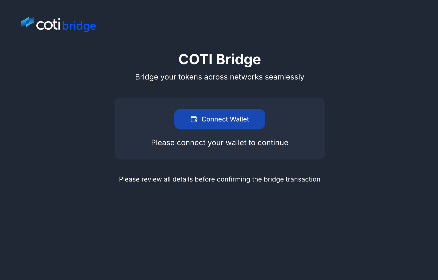 <figure><img src="https://2557786554-files.gitbook.io/~/files/v0/b/gitbook-x-prod.appspot.com/o/spaces%2FeC83qbrBhITO4kE7kTNB%2Fuploads%2Fgit-blob-06f6d0e9d97c4d73d1ddbbfb31e4c1425dd54061%2Fimage.png?alt=media" alt=""><figcaption><p>COTI Bridge Homepage</p></figcaption></figure>