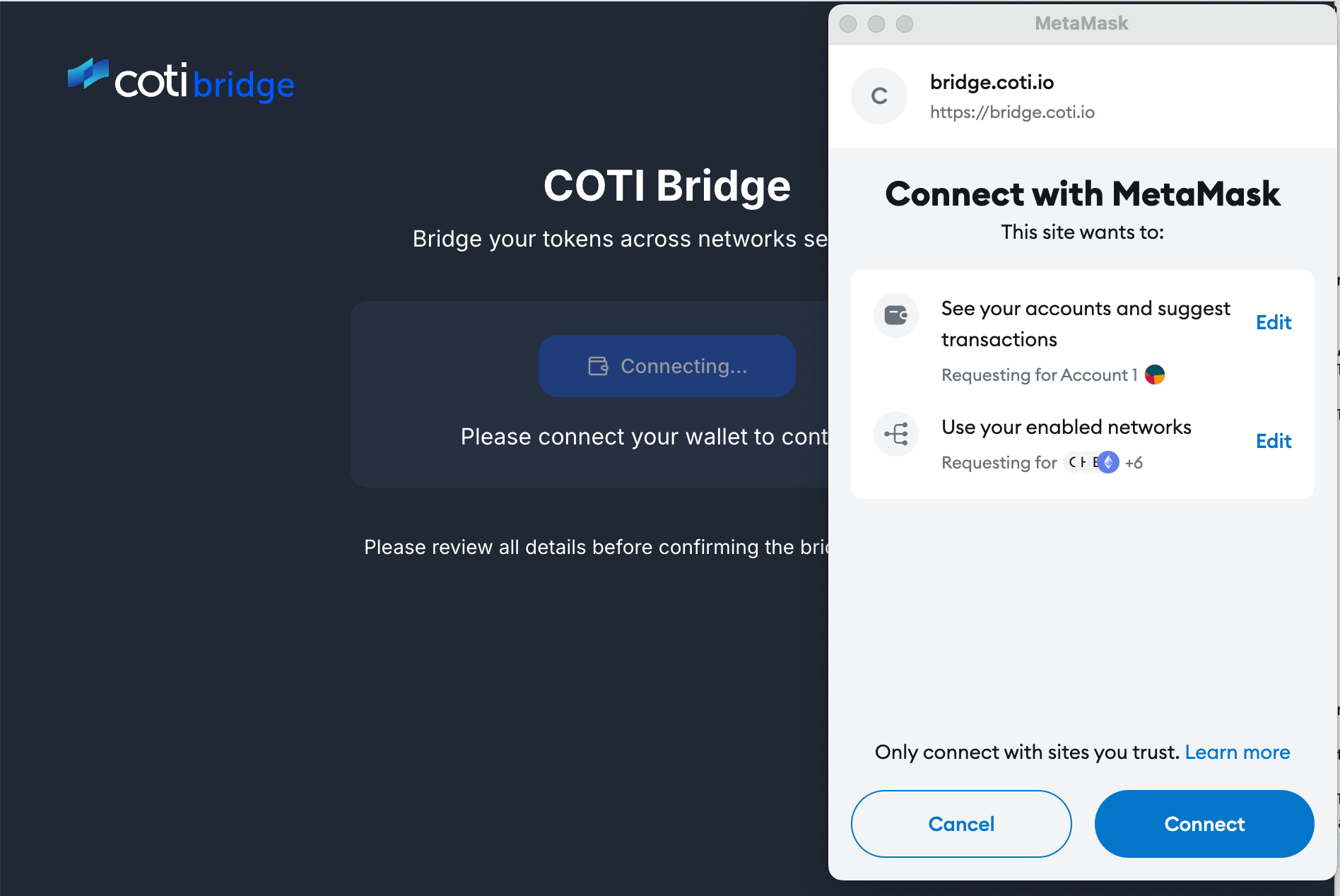 <figure><img src="https://2557786554-files.gitbook.io/~/files/v0/b/gitbook-x-prod.appspot.com/o/spaces%2FeC83qbrBhITO4kE7kTNB%2Fuploads%2Fgit-blob-12918fbf729051bfdf853c8e6c675bbd186ad81d%2Fimage%20(23).png?alt=media" alt=""><figcaption><p>COTI Bridge MetaMask Connection</p></figcaption></figure>