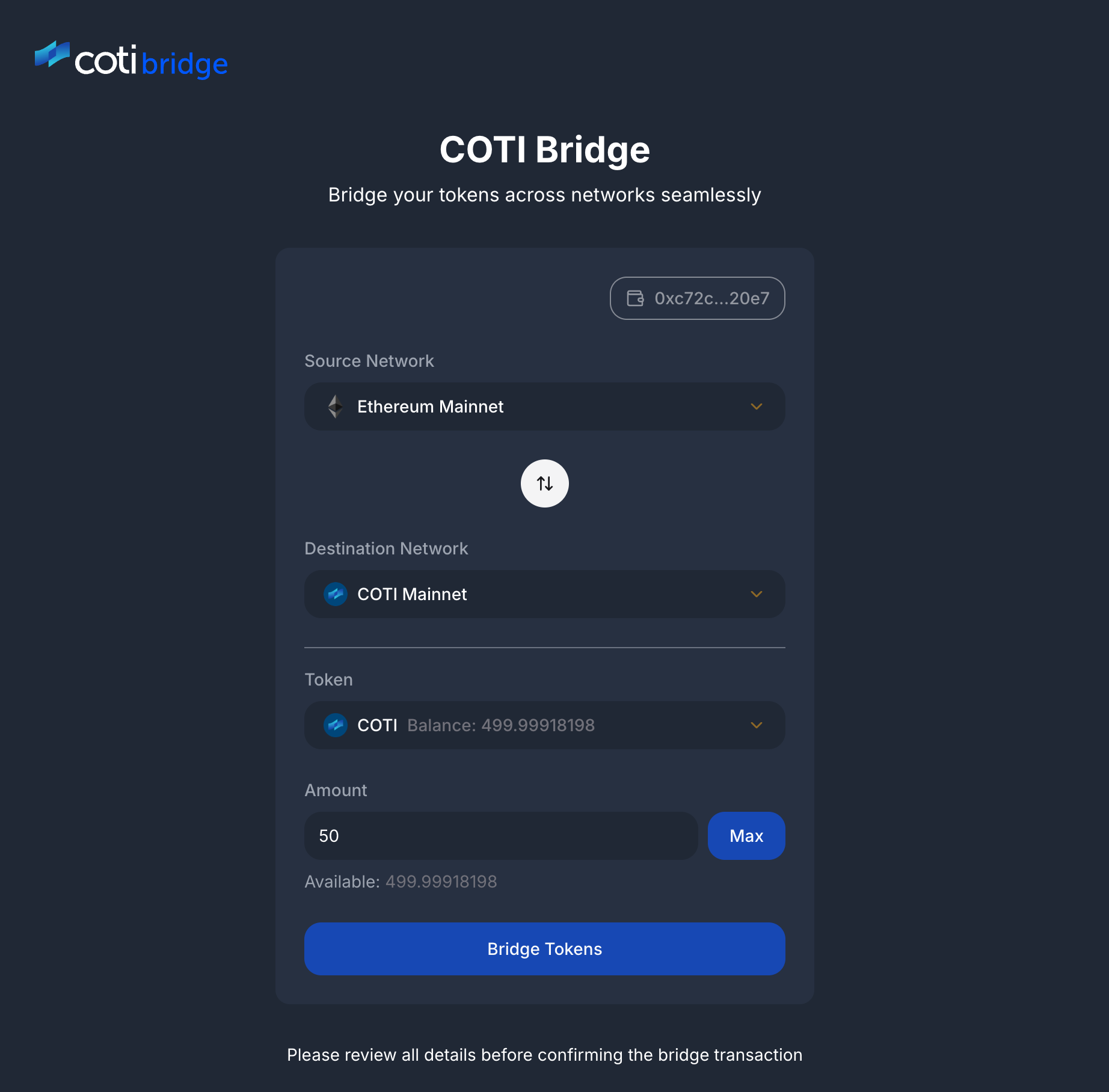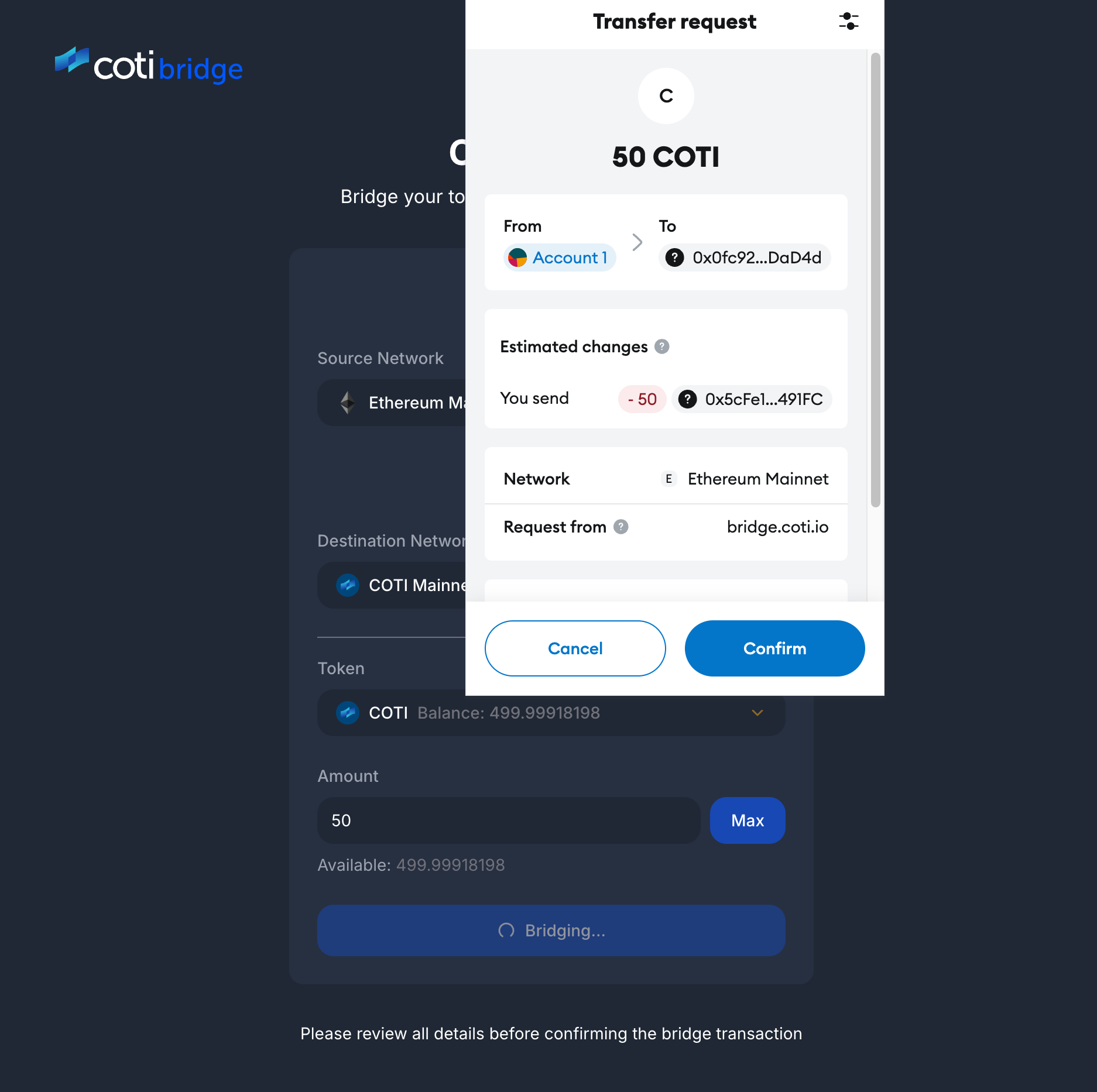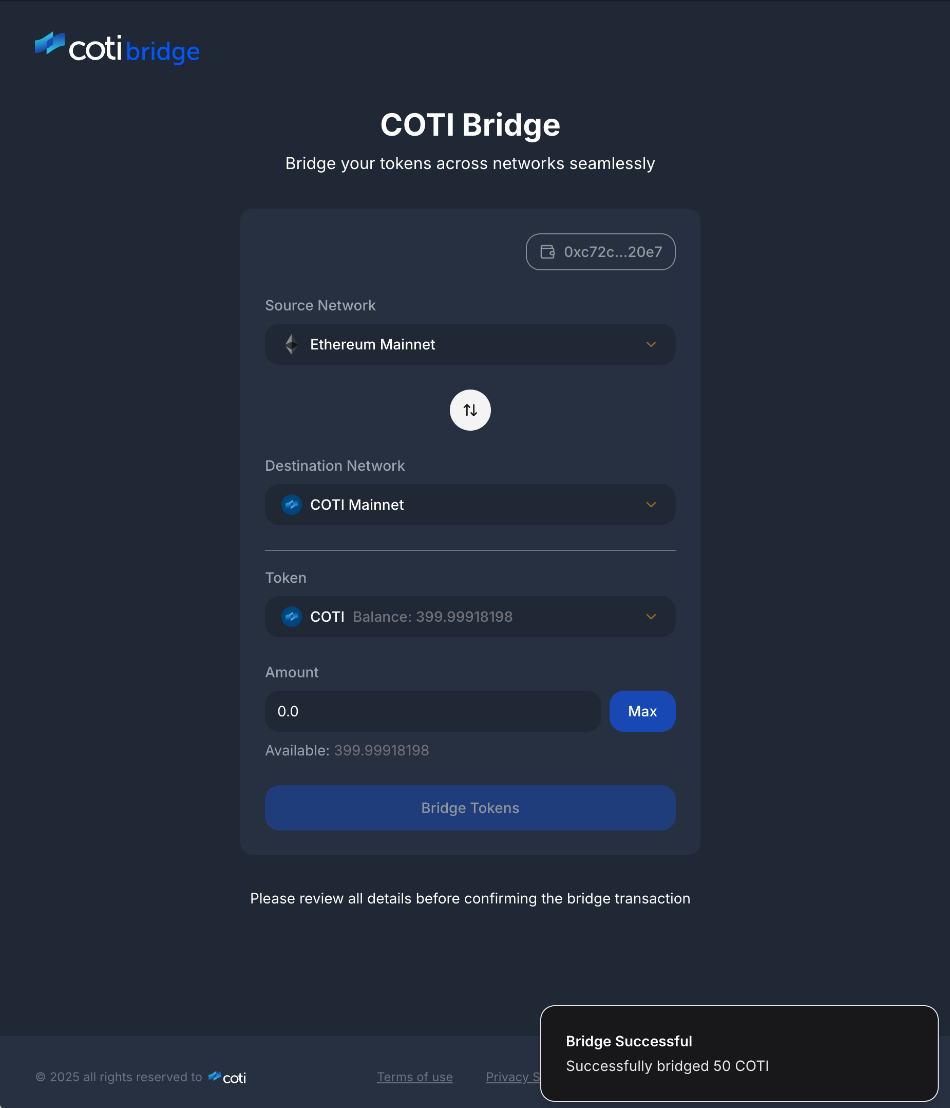 <figure><img src="https://2557786554-files.gitbook.io/~/files/v0/b/gitbook-x-prod.appspot.com/o/spaces%2FeC83qbrBhITO4kE7kTNB%2Fuploads%2Fgit-blob-a804deb7f5390a8bece23a7ce578cb2fa5462734%2Fimage.png?alt=media" alt=""><figcaption><p>COTI Bridge Transaction Confirmation</p></figcaption></figure>