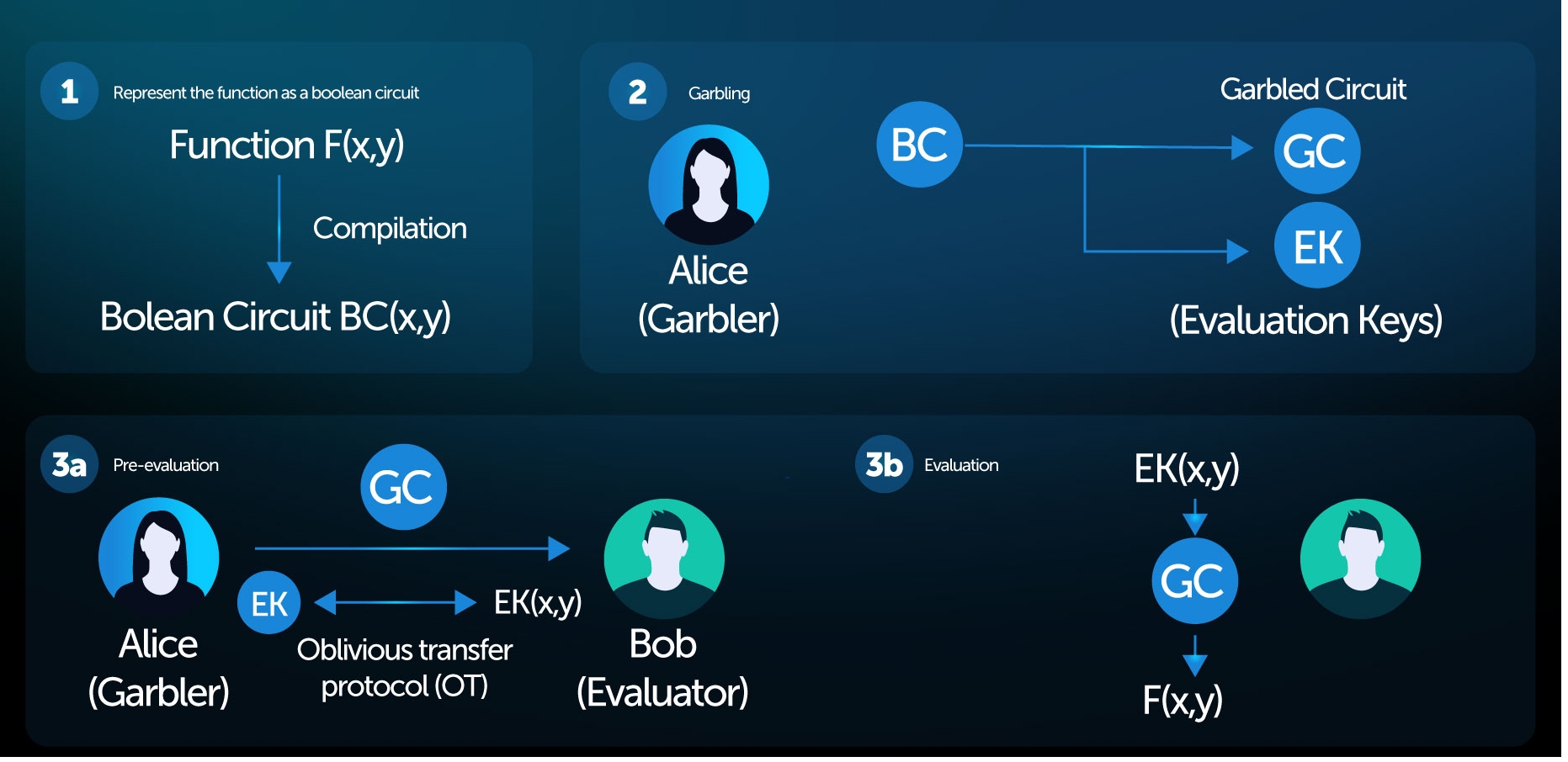 This is obviously a simplified explanation, visit the Garbled Circuits page for a more detailed walkthrough of the process.